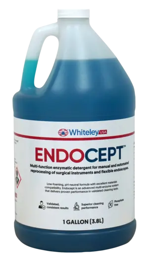 Endocept™ is a specifically formulated with a high-quality, concentrated blend of medical-grade enzymes provides excellent cleaning efficacy that produces consistent results in validated cleaning tests, rapidly removes protein-rich biological soils and bioburden and passes most commercial soil tests.