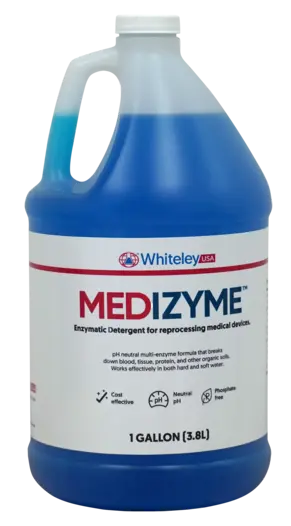 MEDIZYME™ is pH neutral multi-enzyme formula that breaks down blood, tissue, protein, and other organic soils. Medizyme™ provides an effective method for cleaning complex instruments and acts quickly by penetrating and degrading dried blood and other proteinaceous matter that is difficult to remove.